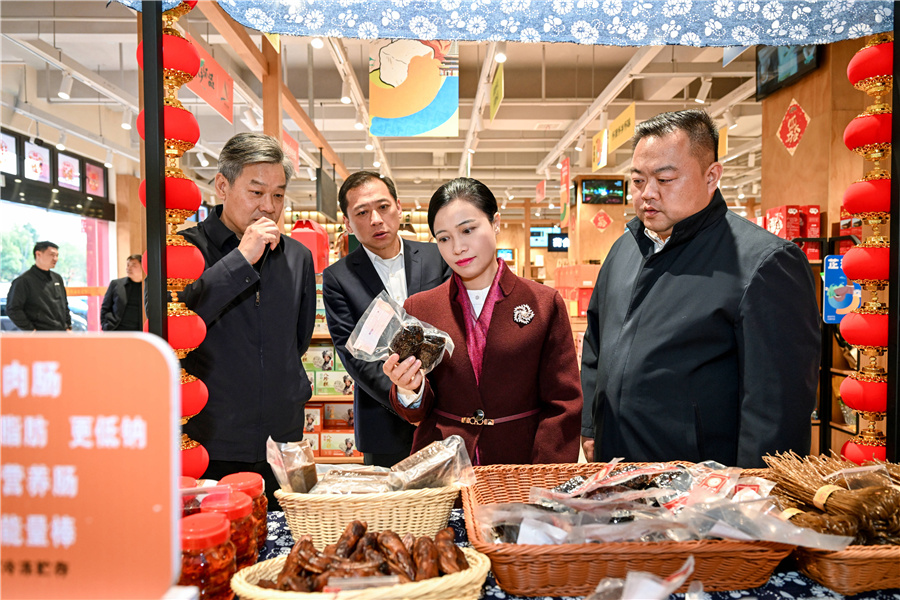 (1月9日下午,市委副書記、市長韋朝暉在市文旅體育集團、市農林集團調研。圖為韋朝暉在市農林集團“懷鄉懷品”總店詳細了解市場拓展等情況。懷化日報全媒體記者 吳濤 攝)