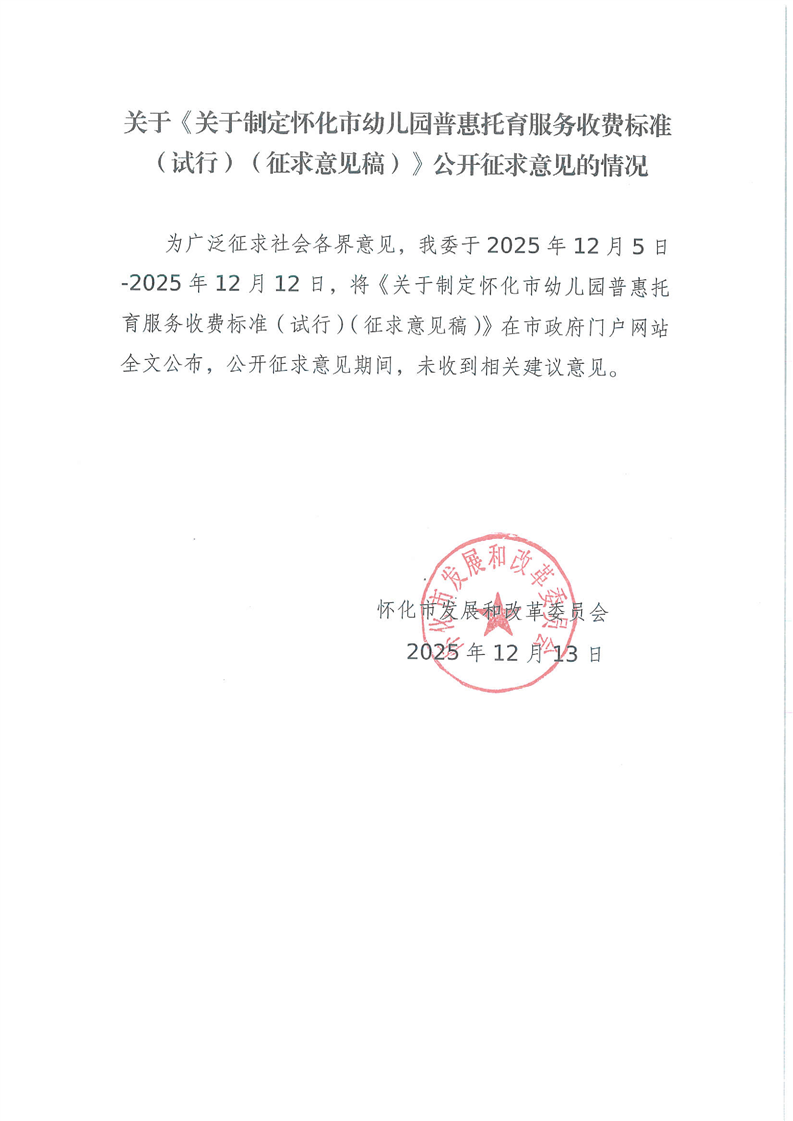 關於《關於製定懷化市幼兒園普惠托育服務收費標準(試行)(征求意見稿)》公開征求意見的情況