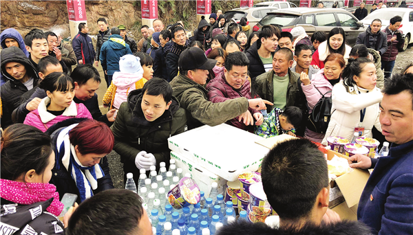 1月28日,洪江市組織工作人員在邵懷高速公路安江出口為被困乘客免費發放餅幹、方便麵和飲用水等食品。由於嚴寒低溫天氣,邵懷高速洪江市路段大麵積結冰,安江出口20 餘輛大巴車被困。該市立即調撥救援物資,幫助被困群眾。(楊錫建 向華 攝)
