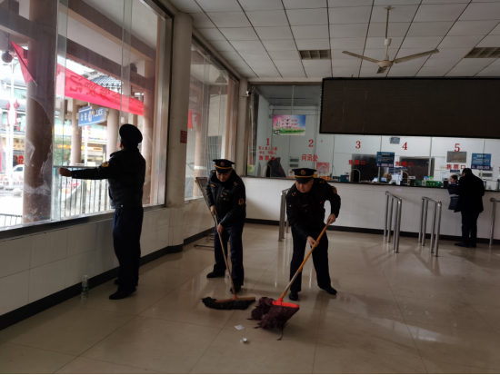 圖2 黨員誌願者們正在打掃汽車站售票大廳