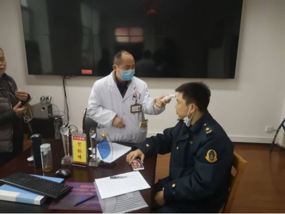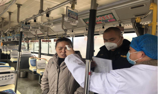 圖一:執法人員與衛健部門對公交乘客測體溫