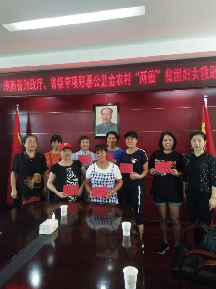 2019年上半年,懷化市共爭取到省級專項彩票公益金、農村“兩癌”貧困婦女救助金32.4萬元,救助全市27名兩癌貧困患者,旨在幫助不幸患病的貧困婦女們能充分發揚“自尊、自信、自立、自強”精神,積極樂觀麵對生活,堅強勇敢對抗病魔,把黨和政府的關愛化作戰勝疾病的力量,用頑強的意誌創造美好燦爛的明天。(圖為8月28日,洪江市“兩癌”貧困婦女救助金發放現場)
