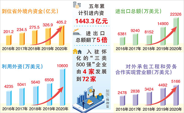 五年累計引進內資1443.3億元,進出口總額翻了5倍,入駐懷化的“三類500強”企業由4家發展到72家——