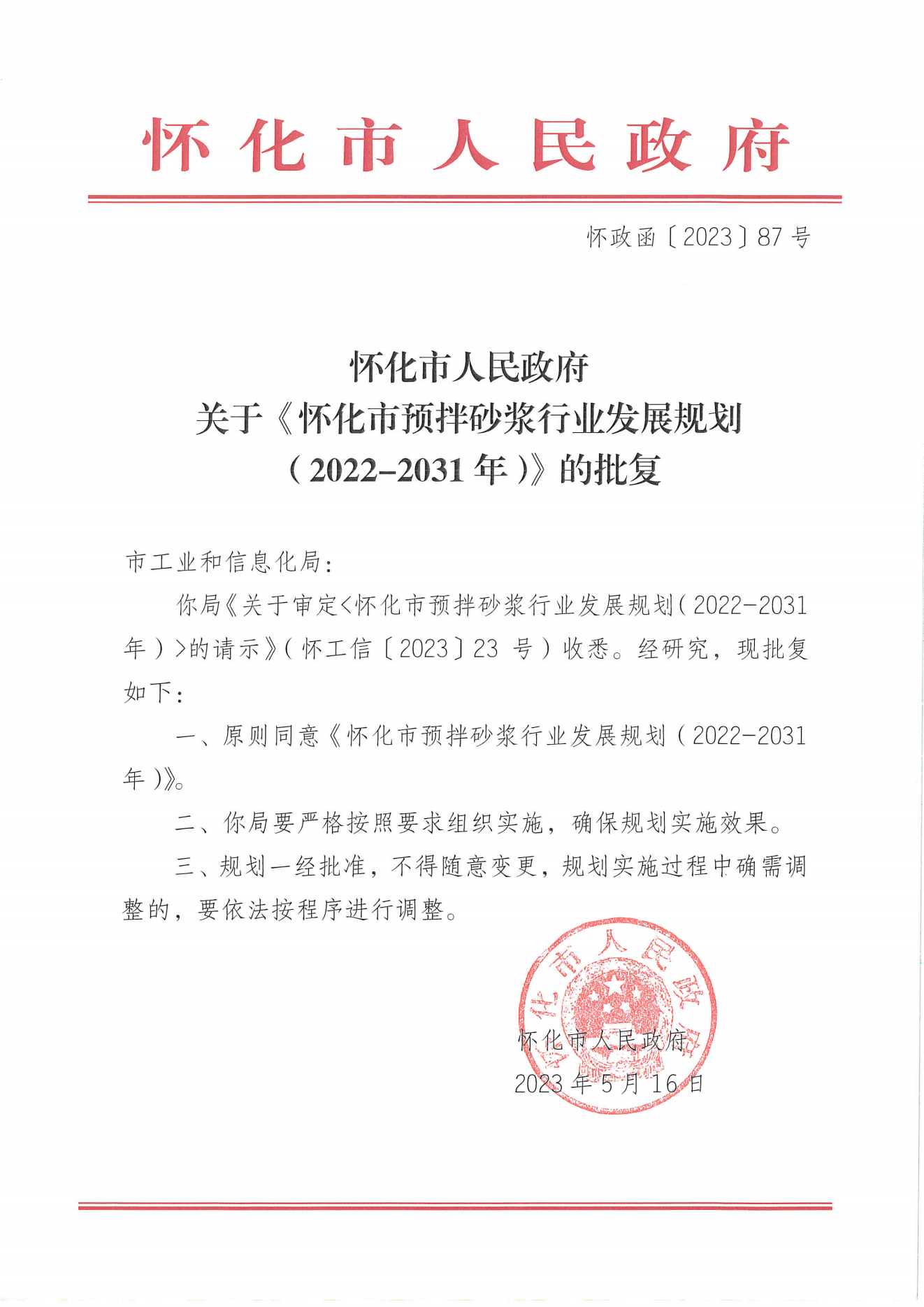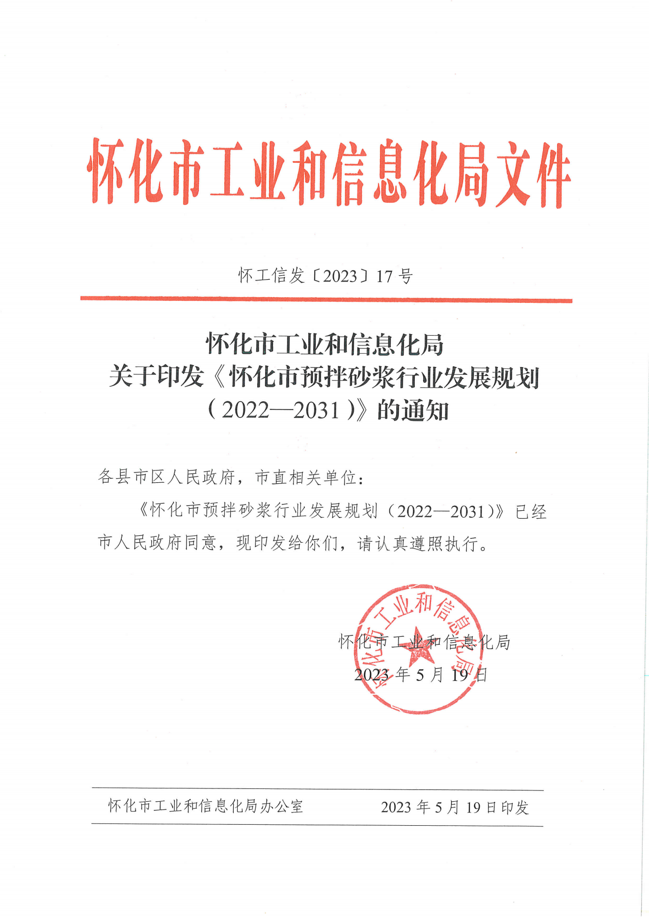 關於印發《懷化市預拌砂漿行業發展規劃(2022—2031)》的通知