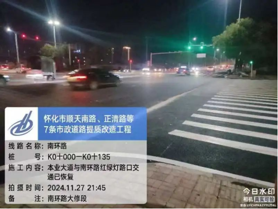 截至11月27日晚,南環路部分道路施工已全部完成並開放交通。至此,該項目涵蓋城區七條道路提質改造施工已全部完成並通車。懷化主城區市政道路三期提質改造施工道路包括正清路、南環路、應民路、順天南路、本業大道、舞水路及紅星南路。項目施工裏程共計13.55km、施工麵積達37.57萬平方米,施工過程中均已對各條道路路麵病害進行處置,並重新攤鋪瀝青混凝土麵層,對應的公交站台、道路標線及周邊綠化等附屬設施也一並進行提質改造。其中包括舞水路、本業大道等道路十字路口一並完成提質改造。