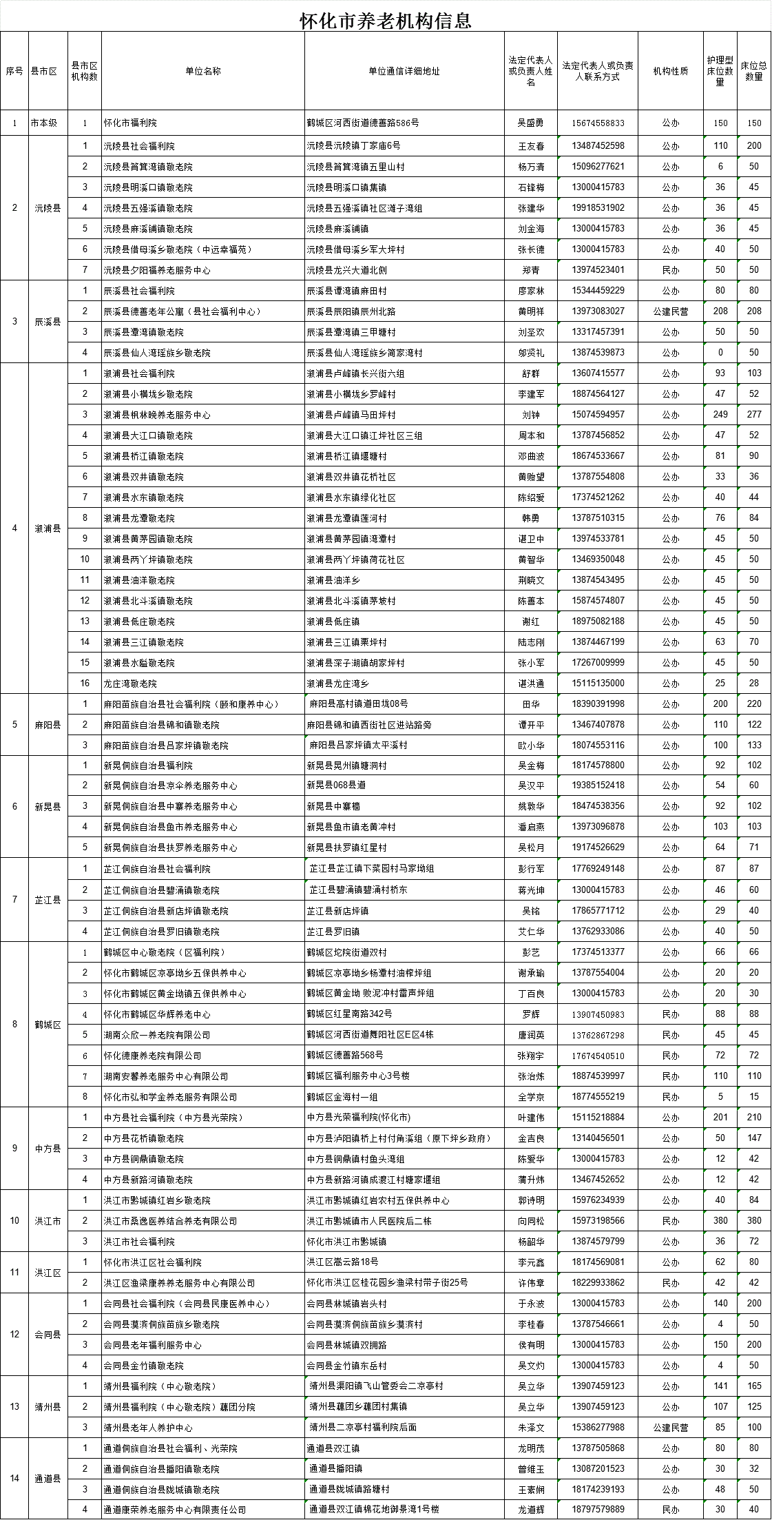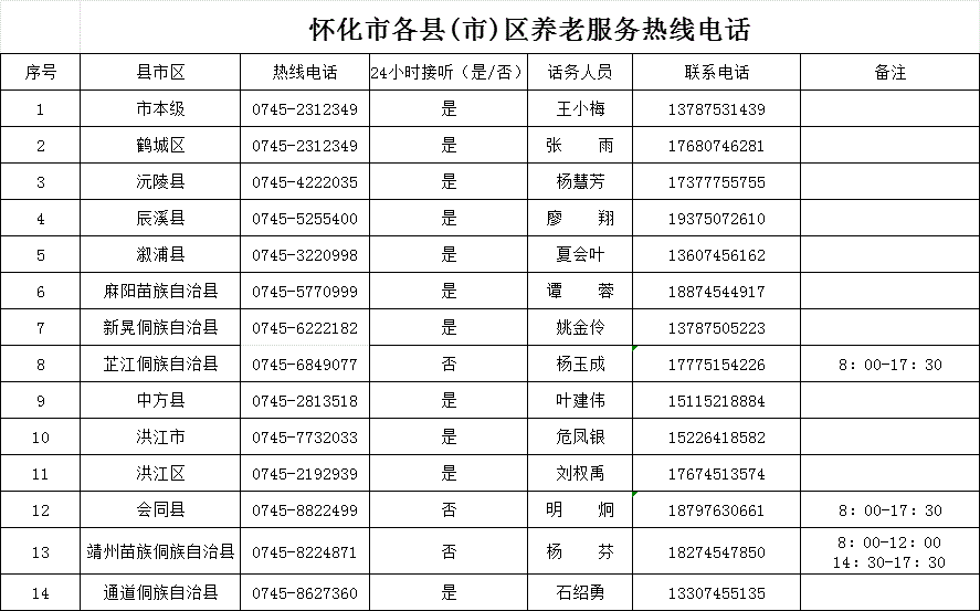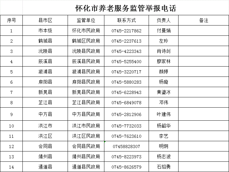 為響應社會為老服務需求,提升養老服務質量,加強對養老機構和養老從業人員的監督,回應民眾關切,推動養老事業和養老產業協同健康發展,經市縣民政部門確認,現將懷化市縣兩級養老服務熱線和監管舉報電話,在懷化轄區內依法辦理法人登記並在民政部門備案且通過消防審驗的養老機構名單予以公布並接受社會各界的監督。