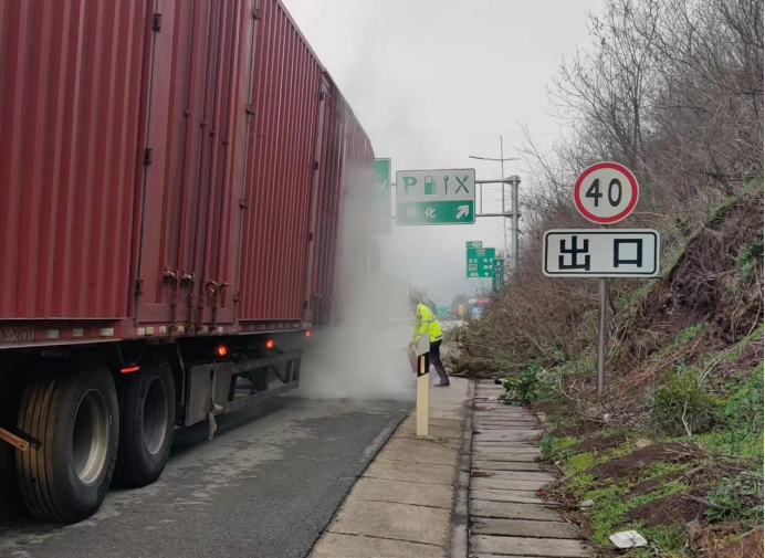 2月9日下午,湖南高速集團懷化分公司麻陽管理所巡查人員在巡查途中,及時發現並製止一輛大貨車右前輪著火冒煙仍在行駛的情況,有效避免了一起車輛自燃事故的發生,為車主挽回巨大經濟損失。