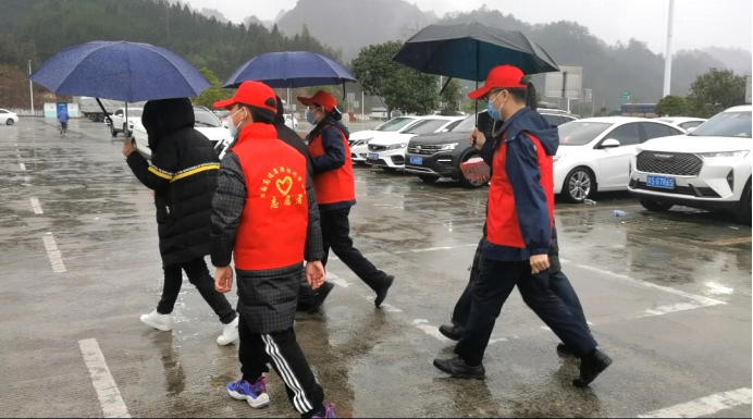 無獨有偶,在通道服務區,一把把“暖心傘”撐起了這風雪旅途上的“晴天”。這次雨雪來得突然,很多司乘車上都沒有帶雨具,在停車區下車後隻能淋雨前往綜合區。“路燈”誌願者了解情況後,主動為每一位司乘撐起暖心傘,在停車區和綜合區之間“迎來送往”。 同時,“路燈”誌願者還為司乘提供指引路線、指揮車輛、發放健康包、送薑茶等服務,暖心的服務得到司乘的一致好評。