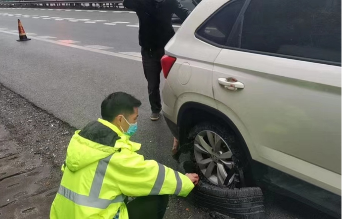 上午9時許,在G60滬昆高速公路東向西方向K1378+650M處,一輛小車因右後輪爆胎停在應急車道上。而司機沒有換胎經驗,隻能在原地幹著急。所幸雪峰山管理所巡查人員在巡查過程中及時發現,並用隨車維修工具迅速幫其換好輪胎。