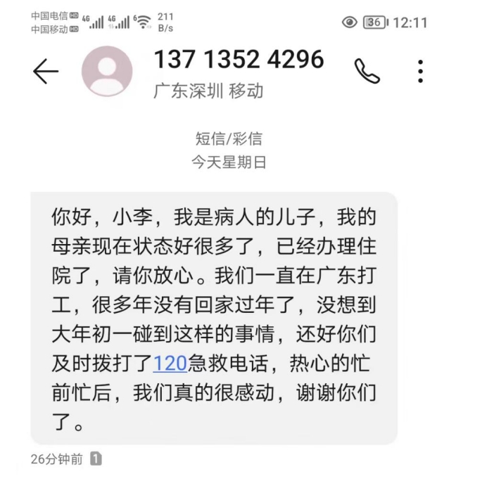 待老人各項體征平穩後,收費班長李高強收到了一條感謝短信,對收費站的暖心幫助表示感謝。