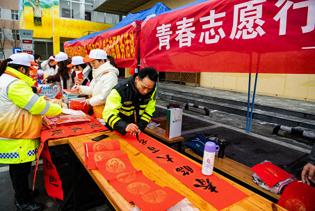 圖6“路燈”誌願者在寫春聯(田文國 圖)