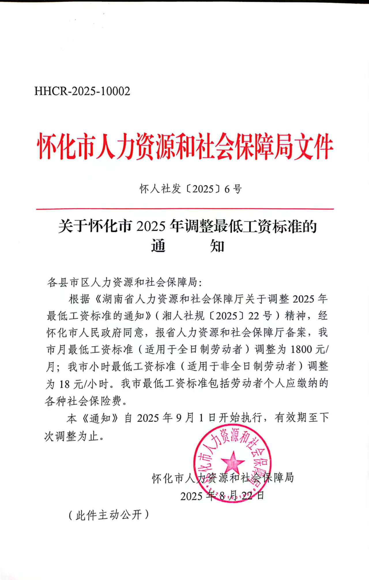 關於懷化市2025年調整最低工資標準的通知