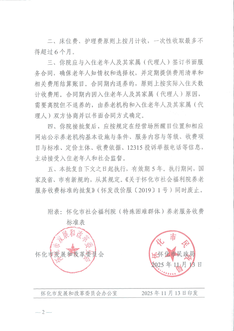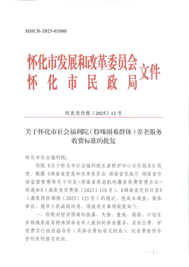 關於懷化市社會福利院(特殊困難群體)養老服務收費標準的批複