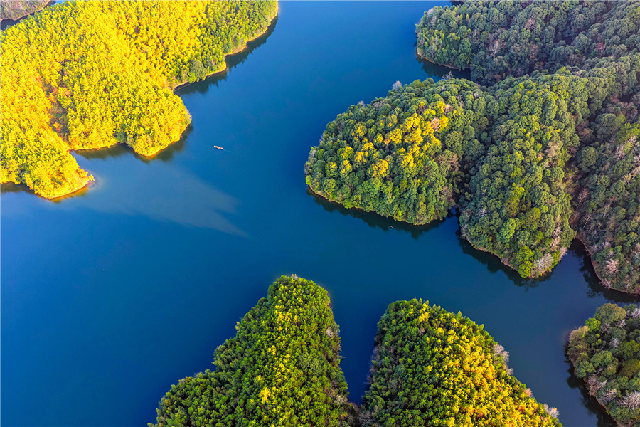 1月8日,通道侗族自治縣曬口水庫,遊客乘船遊覽兩岸秀美風光。