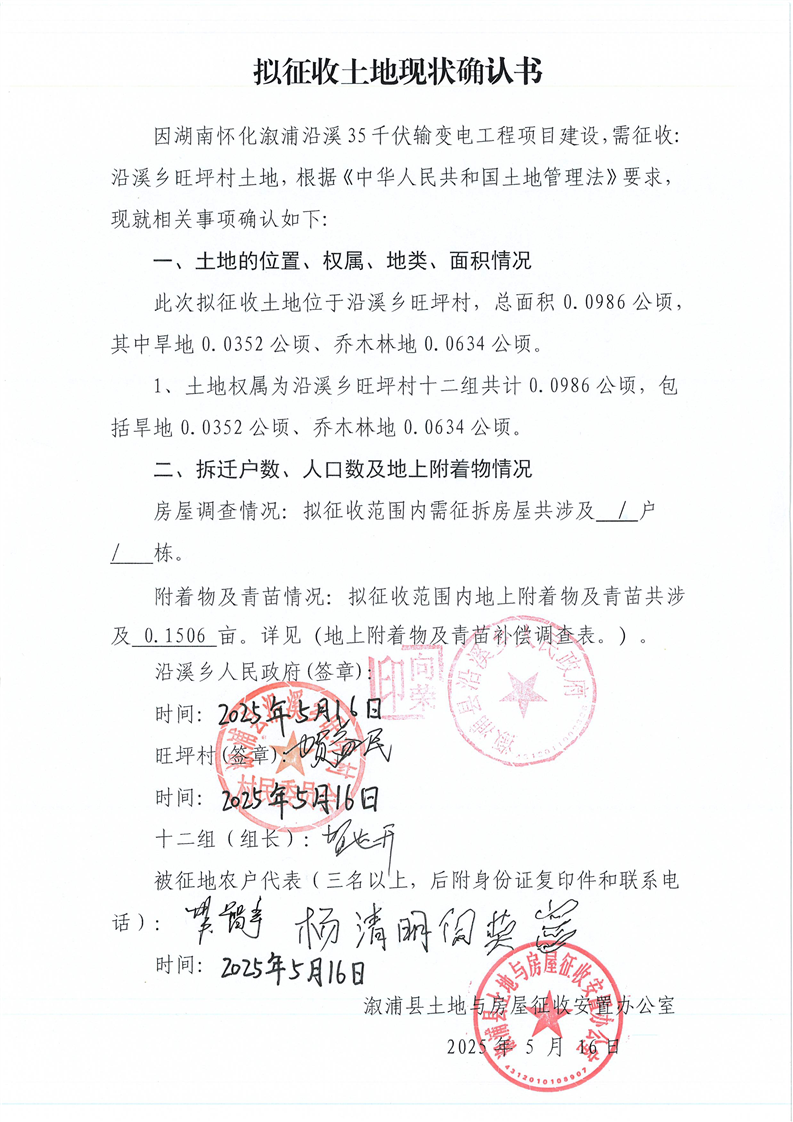湖南懷化漵浦沿溪35千伏輸電變電工程 擬征收土地現狀確認書