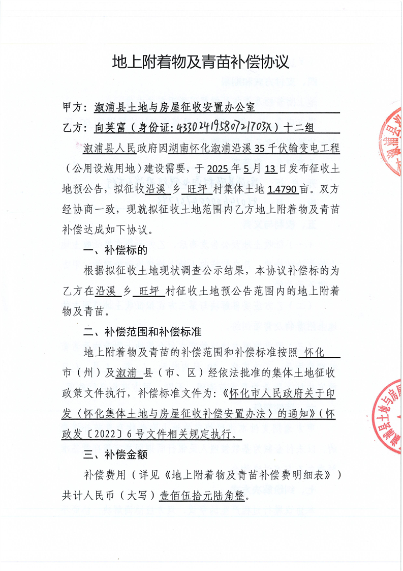 湖南懷化漵浦沿溪35千伏輸電變電工程 青苗補償協議
