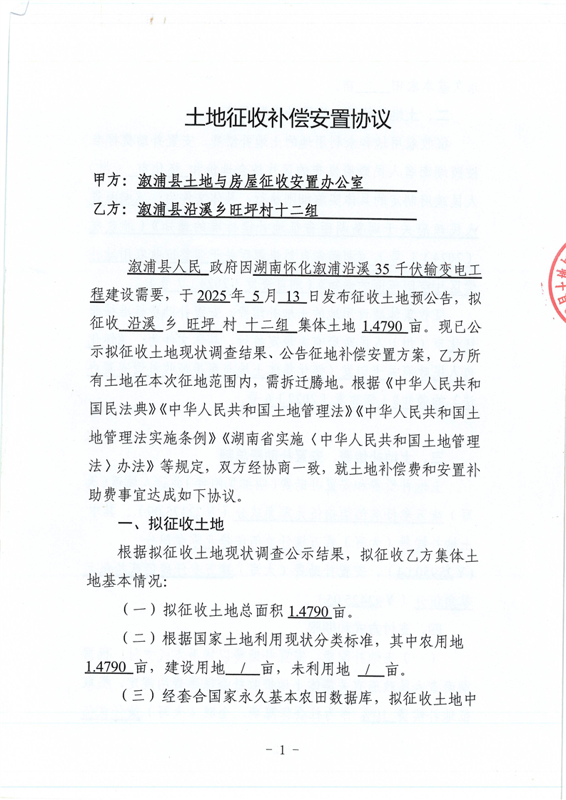 湖南懷化漵浦沿溪35千伏輸電變電工程 征地補償安置協議