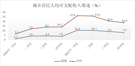 (五)居民收入持續增長。2021年,城鎮居民人均可支配收入28732元,比上年同期增加2104元,同比增長7.9%;農村居民人均可支配收入15244元,比上年同期增加1491元,同比增長10.8%。