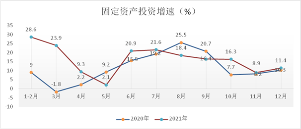 (三)固定資產投資後期持續發力。2021年,全縣全社會固定資產投資同比增長11.4%,比年初目標高0.9個百分點,高於去年同期1.1個百分點。