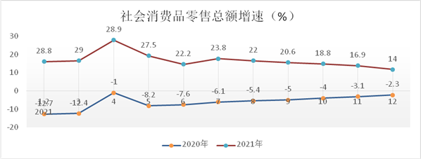 (二)社會消費品零售總額增長放緩。2021年,全縣社會消費品零售總額完成75.6億元,同比增長14.0%,高於年初目標3.5個百分點。