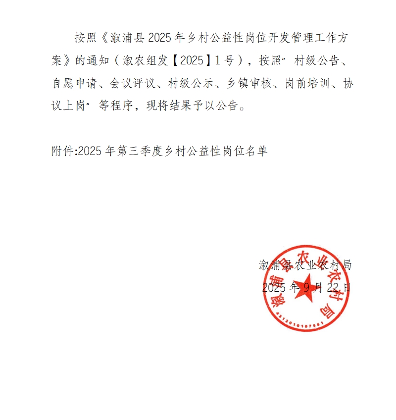 關於漵浦縣2025年第三季度鄉村公益性崗位補助的公示