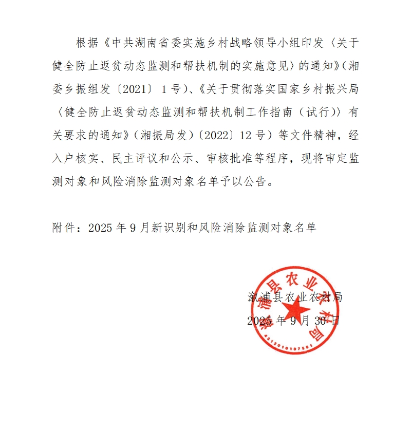 漵浦縣2025年9月份新納入和風險消除監測對象公告