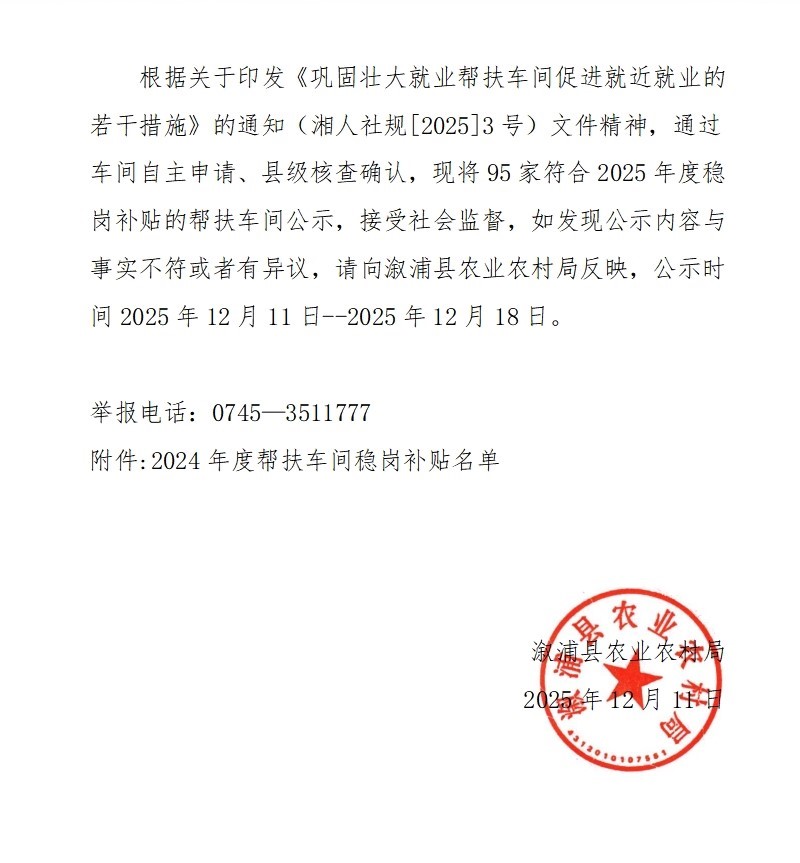 漵浦縣2025年幫扶車間穩崗補貼的公示