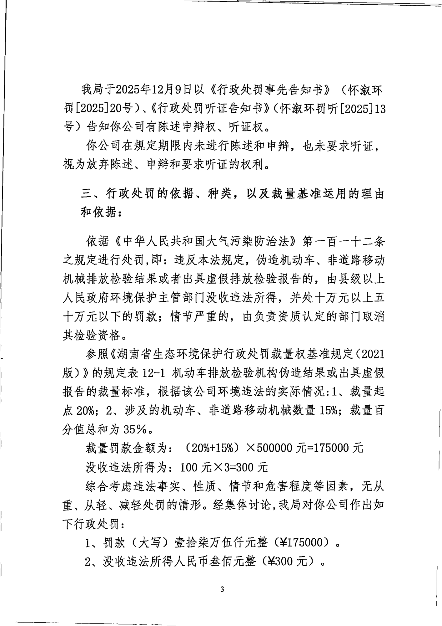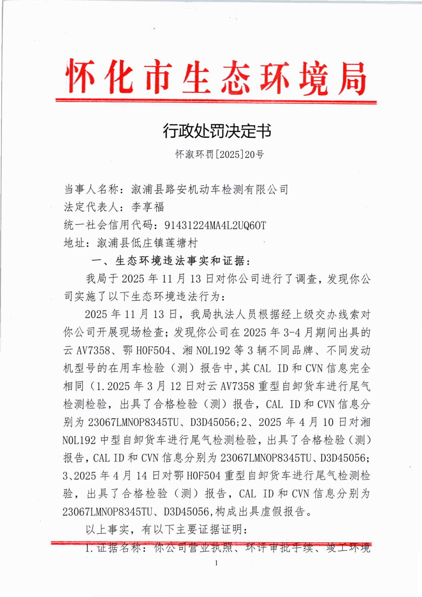 漵浦縣路安機動車檢測有限公司:違反《中華人民共和國大氣汙染防治法》行政處罰決定書