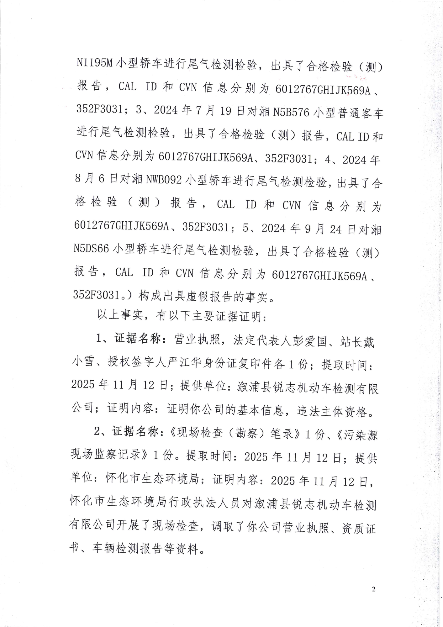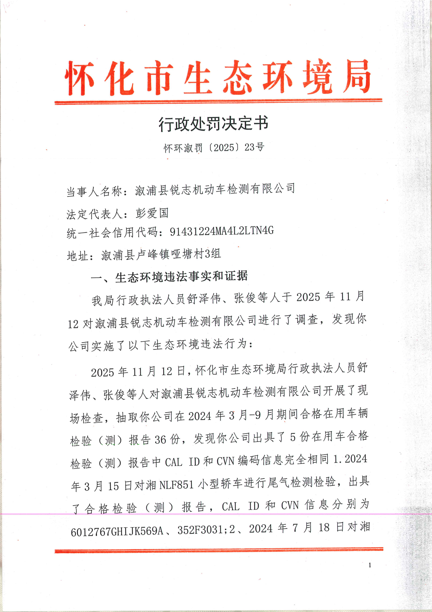漵浦縣銳誌機動車檢測有限公司:違反《中華人民共和國大氣汙染防治法》行政處罰決定書