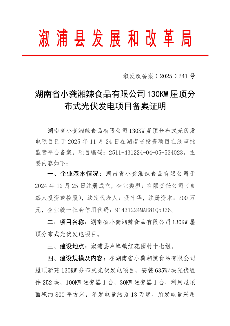 湖南省小龔湘辣食品有限公司130KW屋頂分布式光伏發電項目