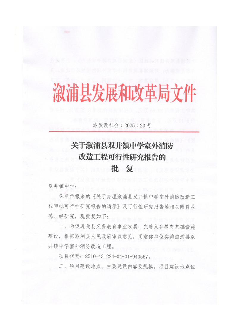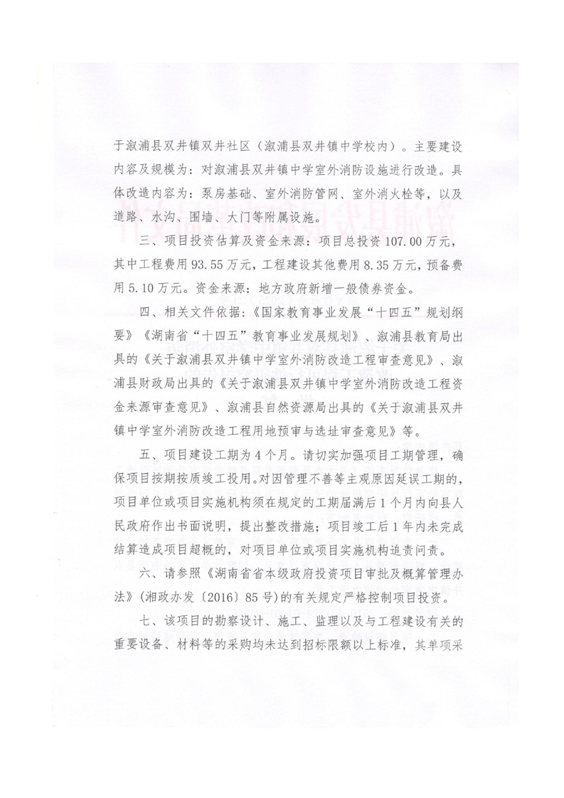 關於漵浦縣雙井鎮中學室外消防改造工程可行性研究報告的批複