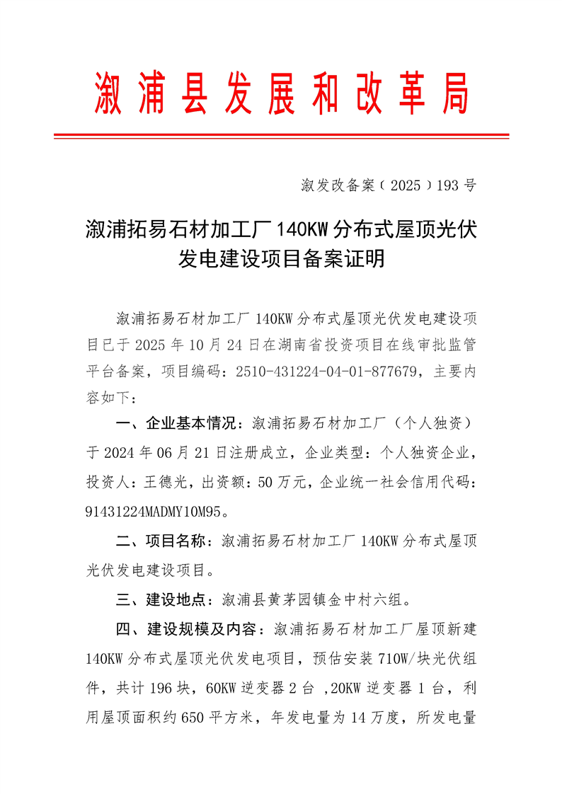 漵浦拓易石材加工廠140kw分布式屋頂光伏發電建設項目