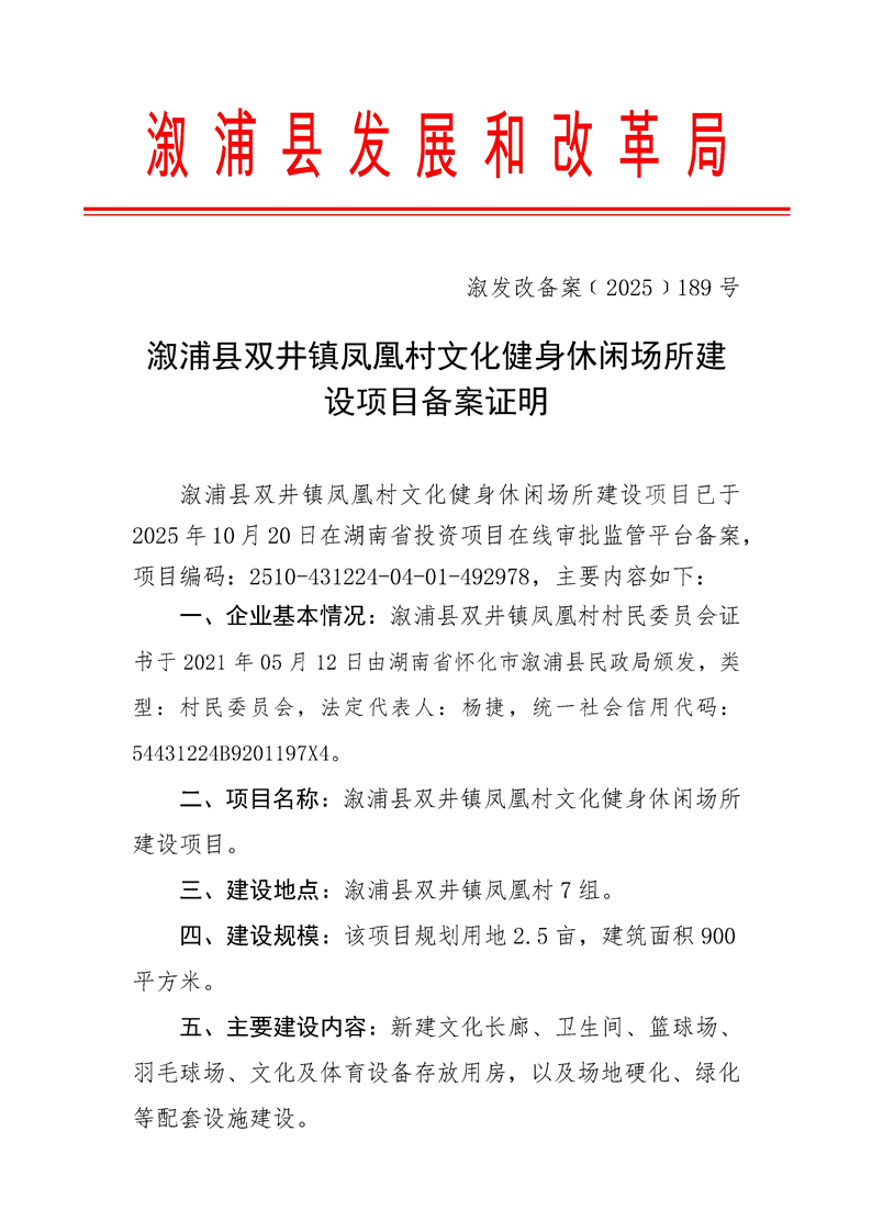 漵浦縣雙井鎮鳳凰村文化健身休閑場所建設項目備案證明