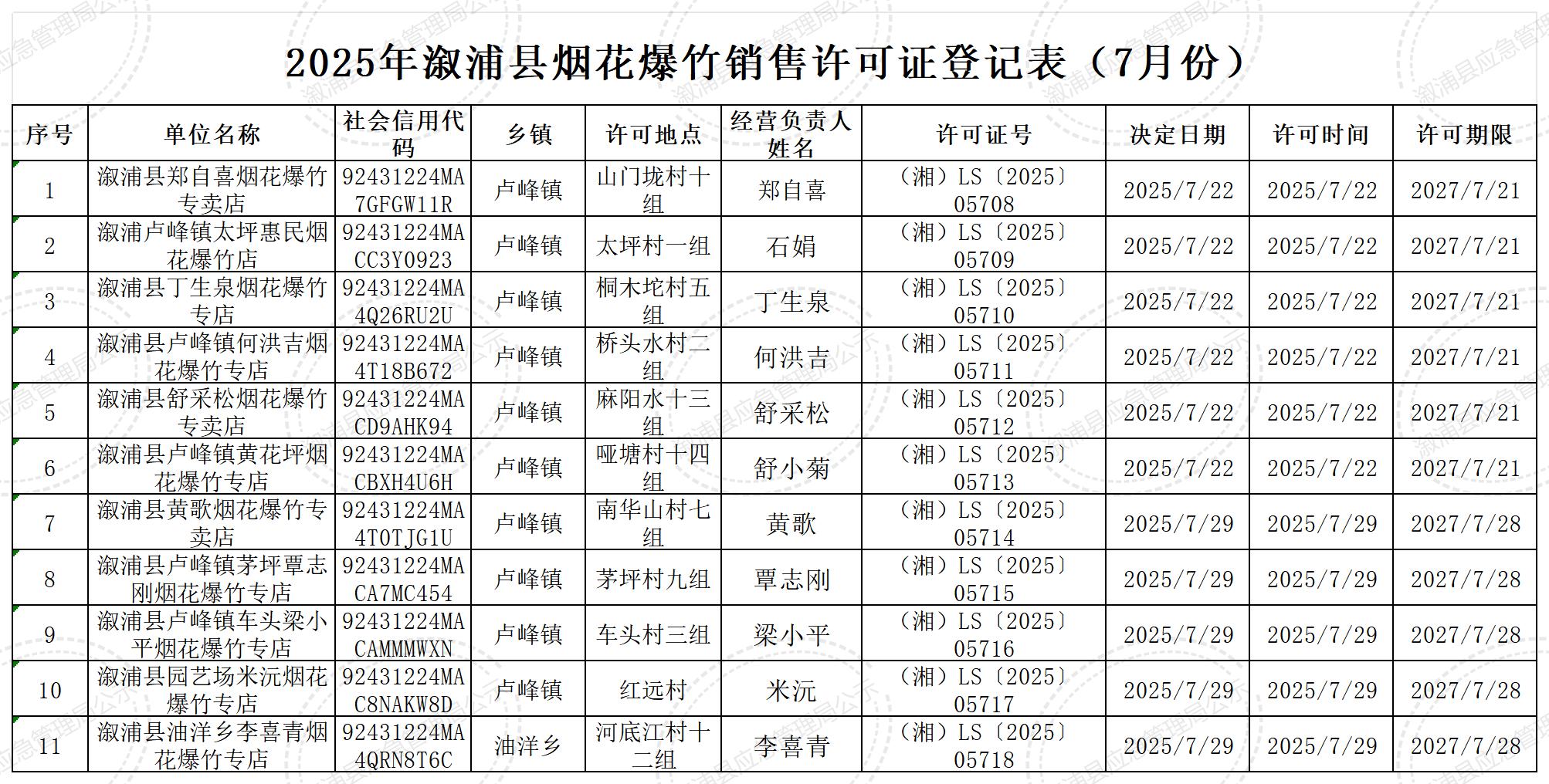 2025年漵浦縣煙花爆竹銷售許可證登記表(7月份)