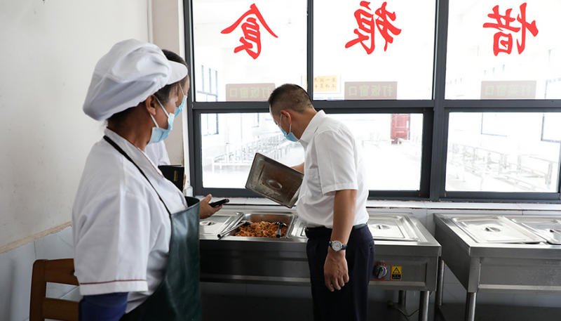 在雙井鎮岩家壟中學檢查校園餐情況時,鄭湘走進食堂後廚,重點檢查了校園餐的食品原材料的采購渠道、索證索票情況,以及食品儲存、加工、留樣、餐具消毒等環節是否符合規範要求。要求切實增強學校對食堂日常工作流程和台賬的檢查,強化食堂工作人員的安全意識;進一步強化主體責任落實,在校內構建校長、食品安全總監、食品安全員的三級管理組織體係,自上而下,層層把關,規範管理。
