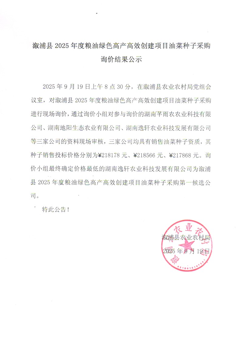 漵浦縣2025年度糧油綠色高產高效創建項目油菜種子采購詢價結果公示