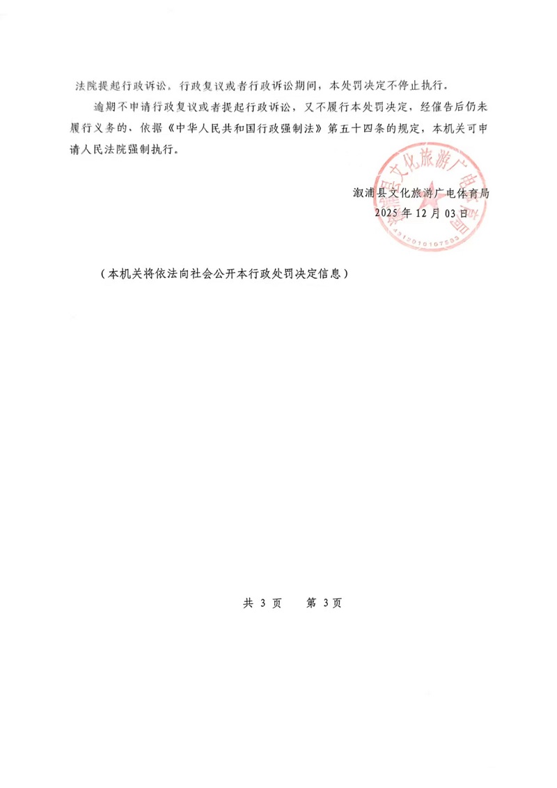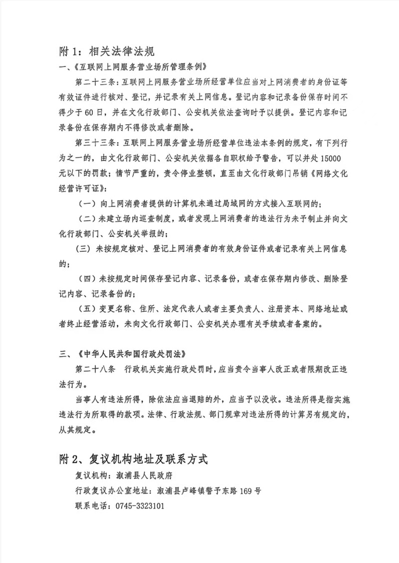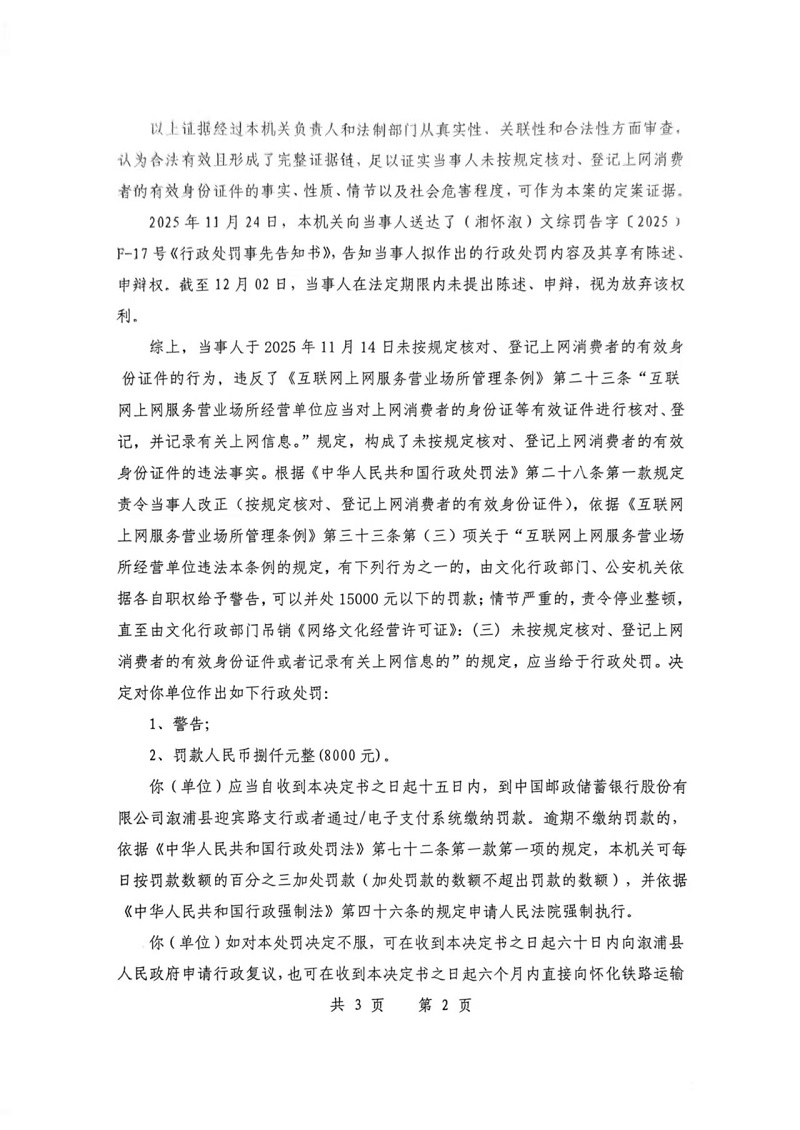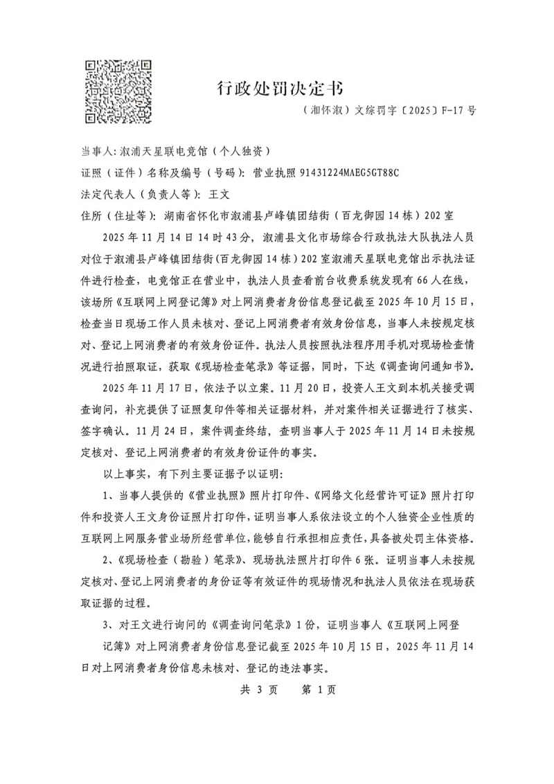 行政處罰決定書--漵浦天星聯電競館(湘懷漵)文綜罰字 〔2025〕F-17號
