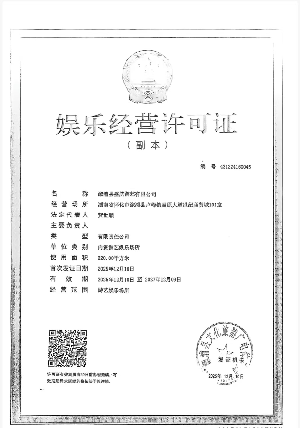 娛樂經營許可證---漵浦縣盛航遊藝有限公司